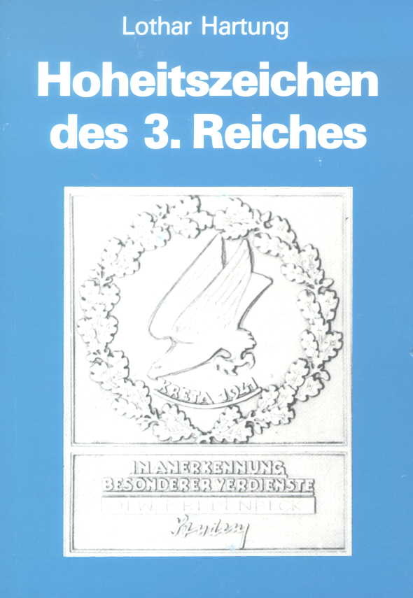 Hartung Hoheitszeichen des 3. Reiches 1. Auflage 112 Seiten, Format Pocketformat C6, DM-Preisbewertungen, zahlreiche Abbildungen,Softcover. Behandelt zahlreiche Brust- und Mützenadler.