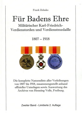Die komplette Namensliste aller Verleihungen von 1807 bis 1918, zusammengestellt anhand offizieller Unterlagen sowie Auswertungs des Achives von Henning Volle, Freiburg. Band 2 des insgesamt dreibändigen Werkes von Frank Zelosko über den badischen militärischen Karl-Friedrich-Verdienstorden und Verdienstmedaille 1807-1918.