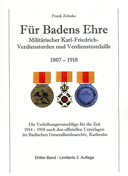Die Verleihungsvorschläge für die Zeit 1914-1918 nach den offiziellen Unterlagen im badischen Generallandesarchiv, Karlsruhe. Band 3 des insgesamt dreibändigen Werkes von Frank Zelosko über den badischen militärischen Karl-Friedrich-Verdienstorden und Verdienstmedaille 1807-1918.
