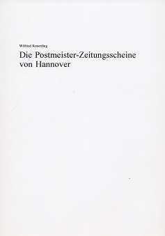Konerding, Wilfried Die Postmeister-Zeitungsscheine von Hannover 1. Auflage 1997,92 Seiten, Format DIN A4, s/w-Abbildungen, broschiert. Handbuch/Katalog zu den Postmeister-Zeitungsscheinen von Hannover mit einer DM Bewertung von Dietmar Kaarz.