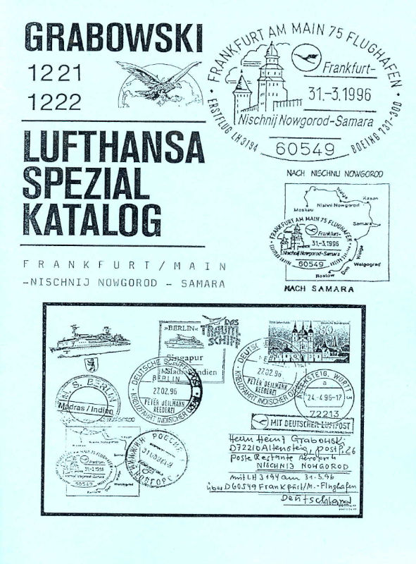 Inhalt: Lufthansaflüge Nr. 1221 und 1222 LH 3194 mit Boeing 737-300 am 31. Närz 1996 von Frankfurt/Main nach Nischnij Nowgorod + Samara. Postsonderstempel als Flugbestätigungsstempel in Frankfurt/Main. Zusätzlich wurde ein GPP-Flugbestätigungsstempel aufgelegt (grün, blau). Über die ILA war ein braunfarbener Kastenstempel erhältlich.