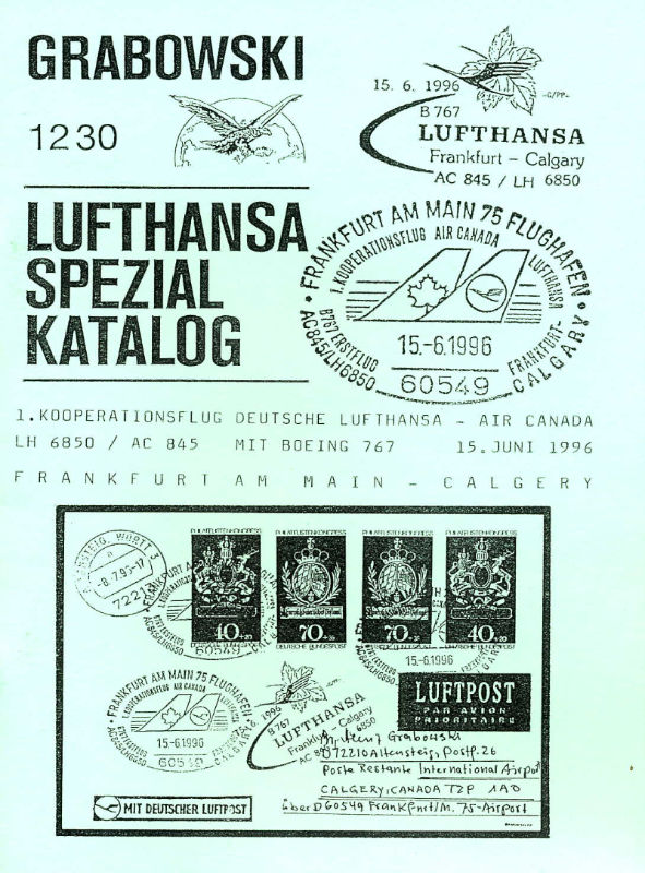 Inhalt: Flug Nr. 1230 1. Kooperationsflug Lufthansa/Air Canad LH6850/AC845 Boing 767 am 15. Juni 1996 Frankfurt/Main-Calgary.