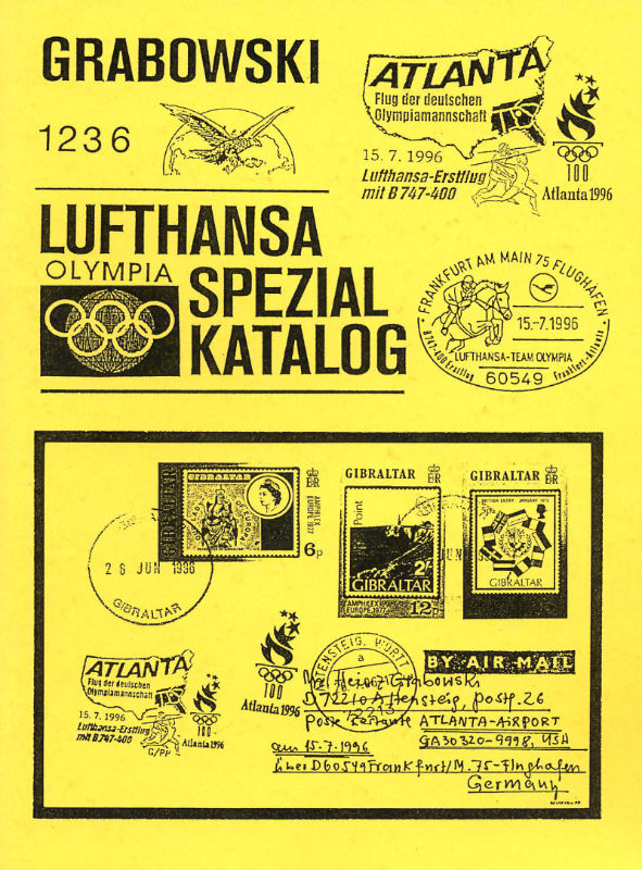Inhalt: Flug Nr. 1236 Frankfurt/Main - Atlanta vom 15. Juli 1996 Olympia-Sonderflugpost Mannschaftsflug nach Atlanta" 14.07.1996