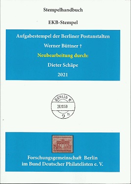 Büttner, Werner / Schäpe, Dieter Stempelhandbuch EKB-Stempel Aufgabestempel der Berliner Postanstalten 1. Auflage 2021, 380 Seiten, Format DIN A4, broschiert. Alle bisher bekannten Stempel mit den neuensten Verwendungsdaten sind aufgeführt.