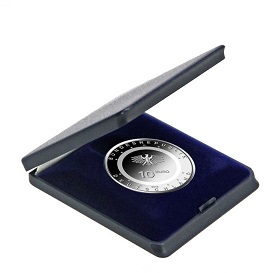 Mit samtbeflocktem, dunkelblauem Einsatz für Münzen bis 30 mm Durchmesser (z.B. 5-DM-Stücke). Deckelkissen innen weisse Seide. Außenabmessungen ca. 62 x 65 x 10 mm