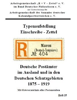 Peltner, Bernhard Typenaufstellung Einschreibe-Zettel Deutsche Postämter im Ausland und in den Schutzgebieten 1875-1919 Mit Ortsverzeichnis aller Postanstalten 1. Auflage 2021, 88 Seiten, 260 Abbildungen, Format DIN A5, Softcover.