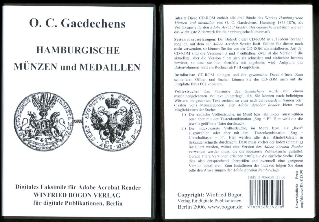 Nr. 8 der Numismatischen Bibliothek. O.C. Gaedechens: Hamburgische Münzen und Medaillen. 3 Bde. Hamburg 1843-1876. XXII, 926 Seiten, viele Abb. im Text. Digitaler Nachdruck für adobe acrobat reader auf CD-ROM.