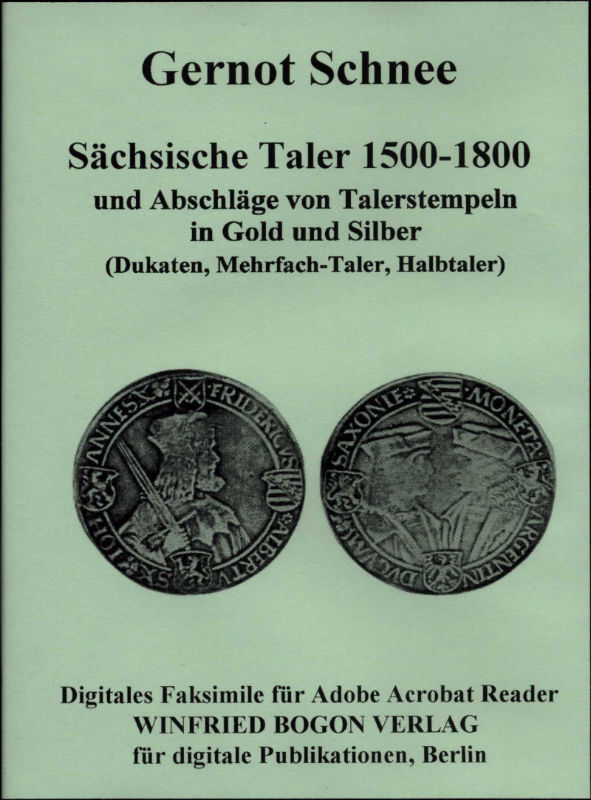 Schnee, Gernot Sächsische Taler 1500-1800 476 Seiten, 1982, Abb. im Text. CD-Rom. Digitaler Nachdruck für adobe acrobat reader. Der Schnee ist seit seinem Erscheinen das beliebteste Nachschlage- und Zitierwerk zu den sächsischen Talern der Jahre von 1500-1800.