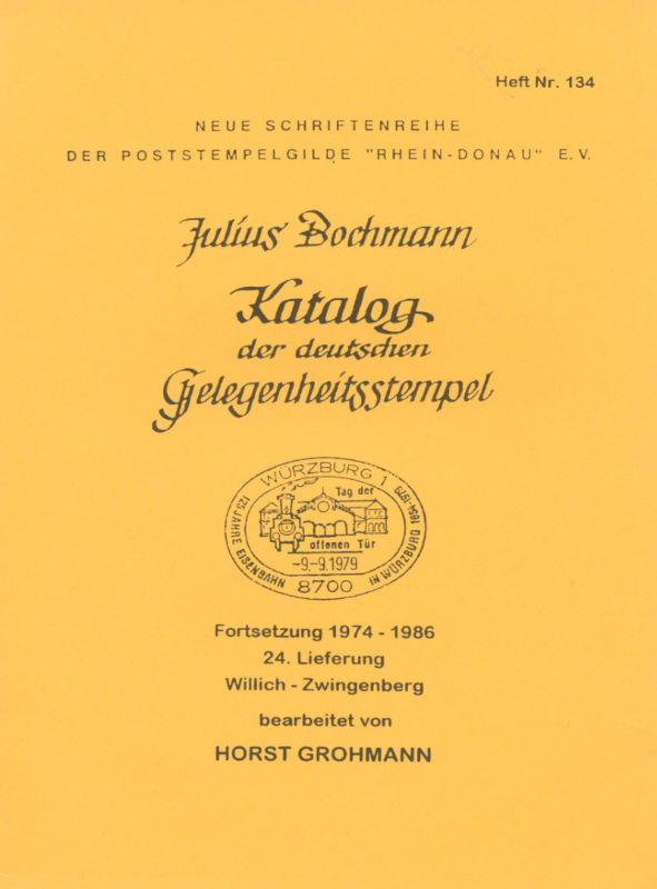 Großmann, Horst Julius Bochmann Katalog der deutschen Gelegenheitsstempel Fortsetzung 1974 - 1986 Heft 134: Willich - Zwingenberg (ohne DDR) 1999, 78 Seiten, Format 14,8x20,9cm, Softcover. Alle Stempel abgebildet und bewertet.
