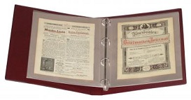 Blätter aus extra stabiler Hartfolie (Außenmaß 210 x 270 mm) für Ganzsachen, Belege und ähnlichem bis ca. 190 x 265 mm. Taschenöffnung oben, 4-Ring-Normlochung 80-80-80 mm Lochabstand.