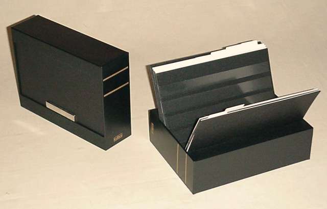 Aus schwarzem, schlagfestem Kunststoff, passend für alle Einsteckkarten im DIN A5-Querformat.Fassungsvermögen etwa 60 Karten aus Karton oder 80 Karten aus Kunststoff mit dekorativen Goldlinien auf der Seitenfläche.