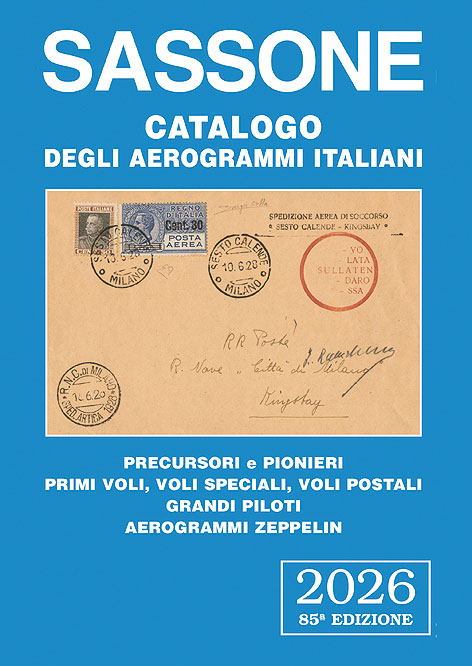 SASSONE 2026 - CATALOGUE OF ITALIAN AIR LETTERSThe catalogue consists, with some updates, of the pages that were already present in the first volume of the Complete Catalogue, after the airmail of the Kingdom of Italy: forerunners and pioneers; first, special and mail flights; great pilots; Zeppelin mail.