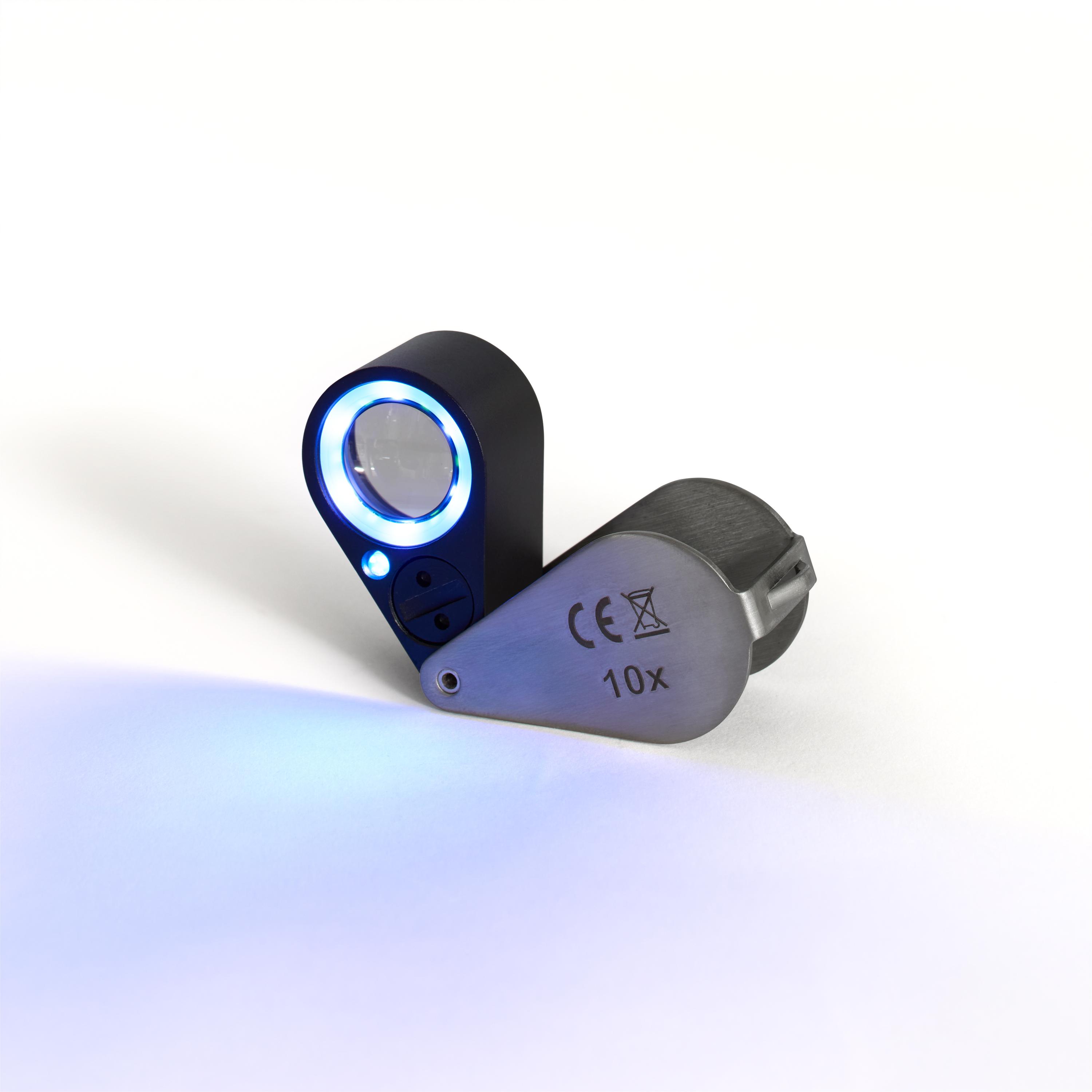 Präzisionslupe (Einschlagslupe) mit 10-facher Vergrößerung. 3-faches Linsensystem mit achromatischer und aplanatischer Linse für farbfehlerfreie und scharfe Abbildungen, auch in den Randbereichen. Besonders deutliche und gleichmäßige Ausleuchtung des Sichtfeldes durch 6 weiße Hi-Tech-LEDs (plaziert am unteren Linsenrand). Zur Prüfung von z.B. Briefmarken und Geldscheinen nutzen Sie die integrierte langwellige UV-Lampe (bestehend aus 7 UV-LEDs). Glaslinse mit einem Linsendurchmesser von 17 mm. Zusammenklappbar. Betrieb mit 3x LR927-Batterien (im Lieferumfang enthalten). Inkl