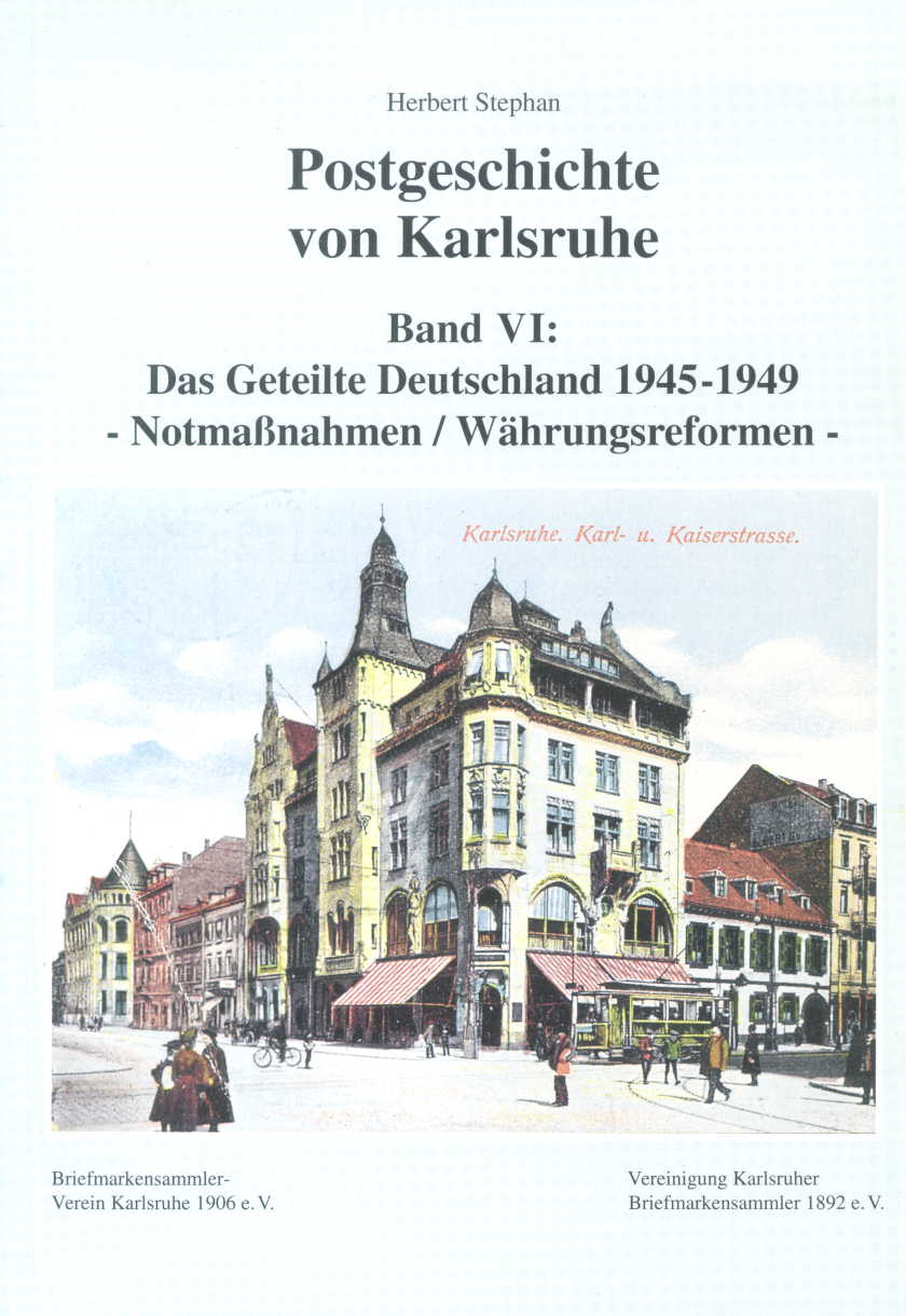 Stephan, Herbert Postgeschichte von Karlsruhe Band VI: Das geteilte Deutschland 1945-49 - Notmaßnahmen/Währunsgreform1. Auflage 1997, Handuch zur Postgeschichte. 72 Seiten, viele teils farbige Abbildungen, Format 14,5x21cm.