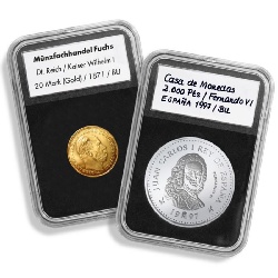 Mit der Münzkapsel Everslab sind Münzen nicht nur hervorragend geschützt. Dank des Beschriftungsfensters können die Kapseln mit individuellen Informationen wie Bezeichnung, Erhaltungsgrad und Prägedatum versehen werden. Mit einem einfachen Klick" lassen sich die Kapseln dauerhaft verschließen. Everslab-Kapseln sind erhältlich für Münzen von 14 bis 41 mm Durchmesser. Zur Unterbringung hält LEUCHTTURM ein umfangreiches Zubehör-Programm bereit. Bei Bedarf bringen Sie darin die Everslab-Kapseln gemeinsam mit den bekannten Slabs (certified coin holders) von NGC, PCGS oder ANACS unter.