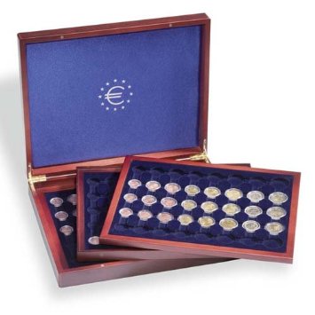 Hochwertige Münzkassette mit 3 Einlagen für 18 Euro-Kursmünzensätze in Kapseln* (LEUCHTTURM CAPS EURO). 3 Einlagen mit je 48 runden Feldern unterschiedlicher Durchmesser. Kassette in Mahagoni farbener Holzmaserung und Einlagen mit veloursartiger Oberfläche. Edler Kissendruck. Sicherer und unauffälliger Magnetverschluss. Außenformat: 330 x 270 x 55 mm.