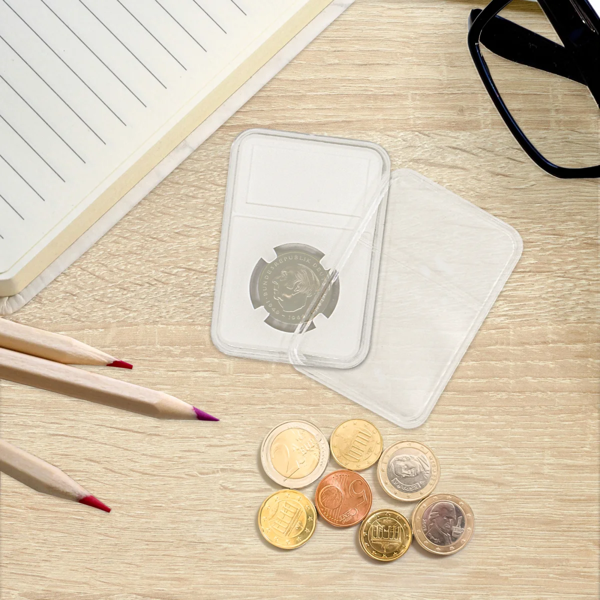Auf einem beigefügten Beschriftungsetikett, welches im Beschriftungsfenster gut sichtbar ist, kann die Münze näher bezeichnet werden (Ausgabe, Erhaltung, Preis etc.)