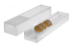Depot für Münzen Nr. 298 Volltransparentes Münzendepot bis 35 mm Durchmesser und bis 2,5 mm dicke. Zum Beispiel für 2€ Stücke, aus stabilem Kunststoff, jede Münze hat ein eigenes Fach. Fassungsvermögen 50 Münzen. Abmessungen: 45 x 40 x 195 mm.