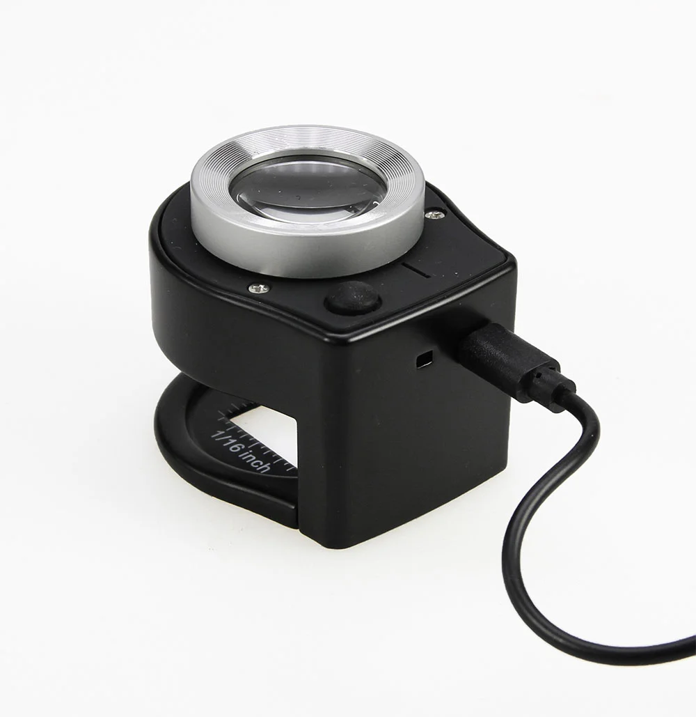 Optische Linse mit 30-facher Vergrößerung. Linsen-Ø 26mm, Metallrahmen mit Messskala zum Vermessen des Betrachtungsgegenstandes. Mit 3 starlen Weißlicht LED"s und 3 UV-LED"s (blaues Licht blangwellig).
