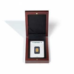 Leuchtturm Etui VOLTERRA für 1x Goldbarren in Blisterverpackung, Mahagoni Nr. 362498 Etui in mahagonifarbener oder schwarzer Holzmaserung zur Aufbewahrung von Barren in Blisterkarten(86 mm x 54 mm). Deckelkissen mit