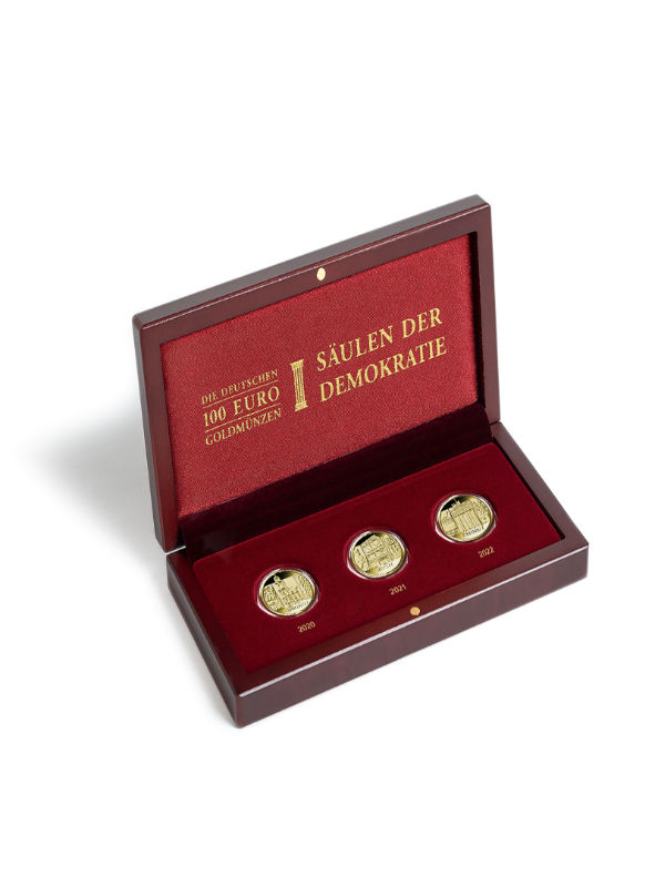 Münzetui in edler, mahagonifarbener Holzmaserung zur Unterbringung der 3 deutschen 100-Euro-Goldmünzen der Serie „Säulen der Demokratie„ in Originalkapseln. 1 Einlage mit