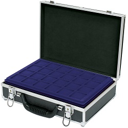 Sammelkoffer im edlen, schwarzen Aluminium-Design. Die passenden Tableaus sind äußerst stabil und rundum mit dunkelblauem Velours überzogen. Dies gewährleistet eine angenehme Handhabung. Die acht Kunststofffüße garantieren einen sicheren Stand und schützen den Tisch, das Regal etc. vor Kratzern. Der Koffer ist abschließbar.