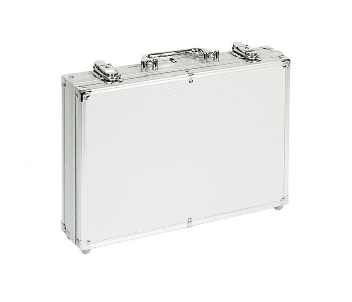 Sammelkoffer im edlen Aluminium-Design. Die passenden Tableaus sind äußerst stabil und rundum mit Velours überzogen. Dies gewährleistet eine angenehme Handhabung. Die acht Kunststofffüße garantieren einen sicheren Stand und schützen den Tisch, das Regal etc. vor Kratzern. Der Koffer ist abschließbar.