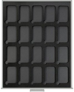 Münzbox mit hellgrauer Schublade und Klarsichtrahmen. Mit einer Münzeinlage aus BLACK SAMT"-Schaumstoff mit 20 rechteckigen Fächern 34 x 54 mm. inkl. 20 rechteckigen LINDNER Münzkapseln mit Innenmaß 27 x 47 mm (Artikel-Nr. S22552747P), für rechteckige Münzbarren 1 oz. Australien (Silber).