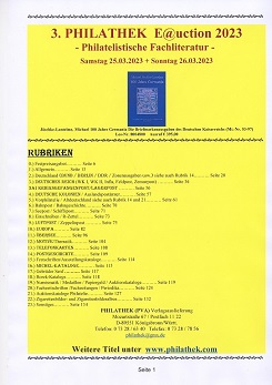 PHILATHEK Katalog ANTIQUARISCHE Philatelistische Fachliteratur Nr. 3-2023Katalog mit 140 Seiten, Format DIN A4, Text deutschInhalt: Deutschland, Dt. Reich, Dt. Kolonien, Europa, Übersee, Motive usw.