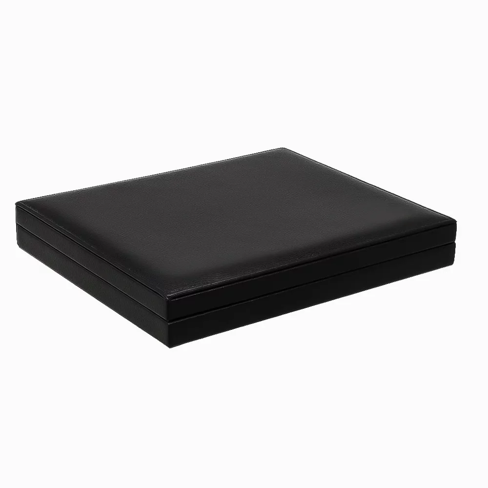 Die Abdeckungen beider Kassetten sind leicht wattiert und mit sorgfältig ausgeführten Nähten versehen, die ihr edles Aussehen unterstreichen. Die Kassetten-Böden als auch die Böden der Tableaus sind mit schwarzem Velours bezogen und schützen so vor Kratzern.