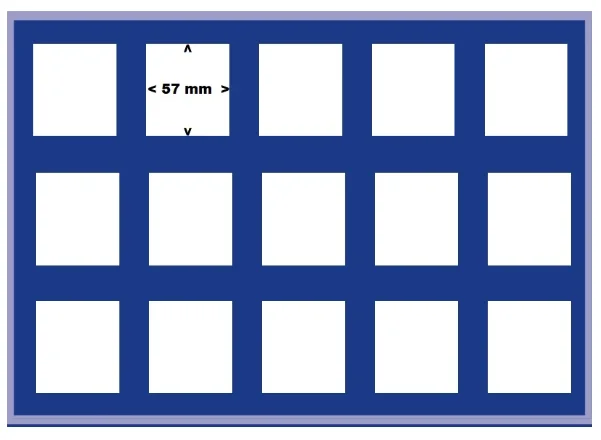15 Fächer  a 57x57 mm z. Bsp. für Medailelln, Zippo-Feuerzeuge (Koffer Nr. 258 fasst 6 Tableaus,  Koffer Nr. 288 fassen 5x Tableaus)