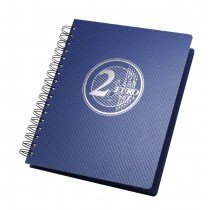 Mit 4 transparenten Eindrück-Blättern für 60 2€-Stücke und farbigen Zwischenblättern. Blauer Design-Karton-Einband, schwarze Spiralbindung. Format 210x235mm.