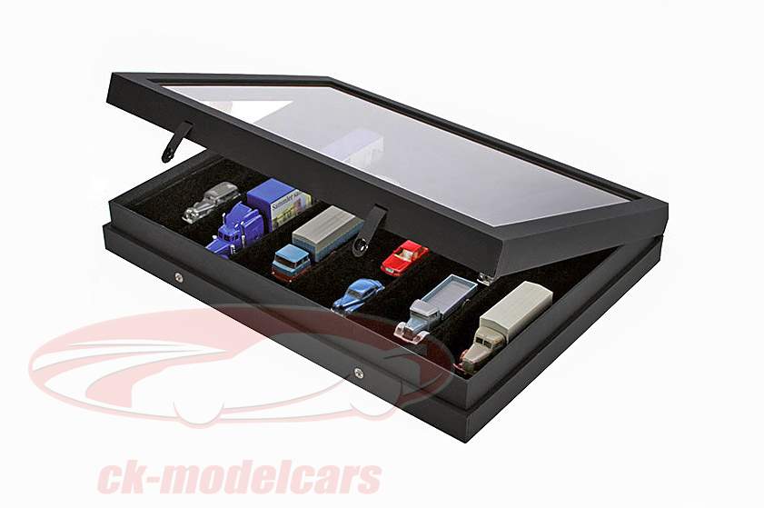 Hochwertige Vitrine "Black Edition" für Autos, Trucks, Eisenbahn· Mit Echtglasabdeckung und stabilem Gehäuse, welches mit einer mattschwarzen Leinenst