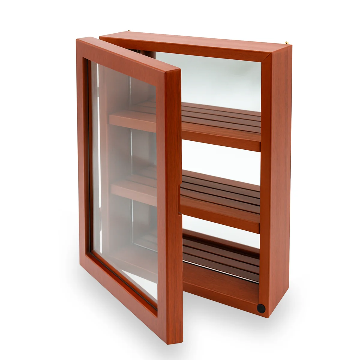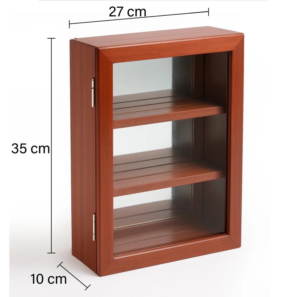 Formschöne Vitrine zur Wandmontage aus stabilem Korpus mit Mahagoni-Furnier für die Aufbewahrung von größeren Plaketten, Orden und Medaillen. Die herausnehmbaren Fachböden haben zwei Kerben (3 + 5 mm Profilbreite) um die Objekte zu stellen. Die Vitrine kann mittels der Ösen an der Rückseite and der Wand montiert werden. Die Türe verfügt über ein stabiles Scharnier auf der linken Seite und eine echt Glas-Verglasung. Eine festverbaute verspiegelte Rückwand lässt Ihre Objekte wunderbar wirken, ebenso kann damit auch die Rückseite der Objekte betrachtet werden.