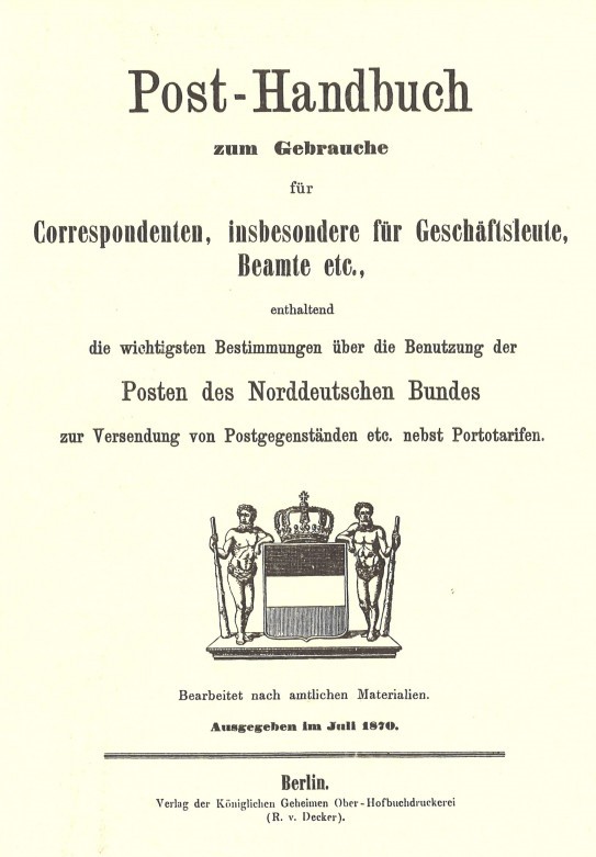 Post-Handbuch zum Gebrauch für Correspondenten, insbesondere für Geschäftsleute, Beamte etc. enthaltend die wichtigsten Bestimmungen für die Benutzung der Posten des Norddeutschen Bundes zur Verwendung von Postgegenständen etc. nebst Posttarifen