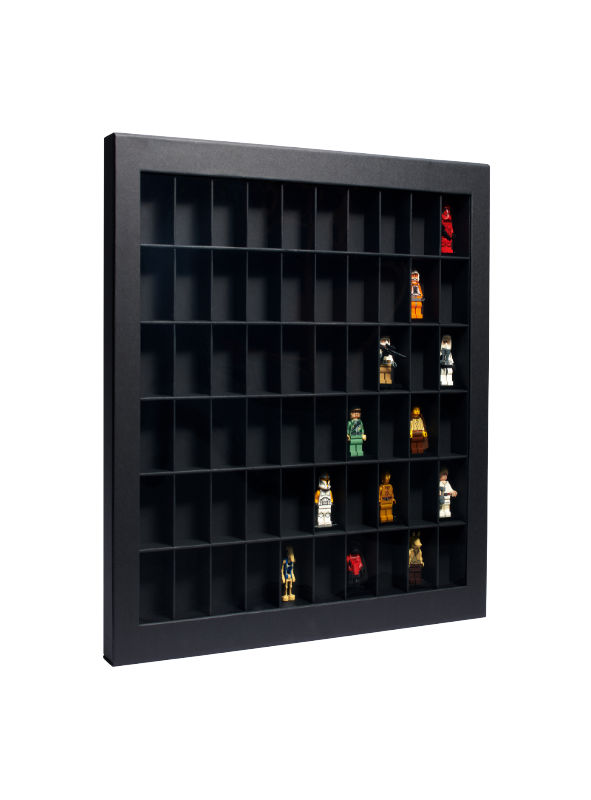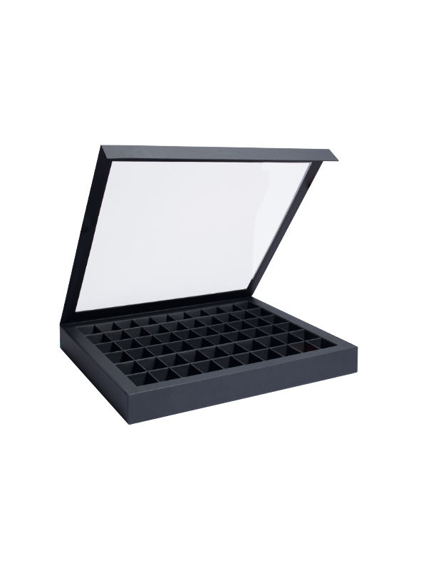 Die Box im minimalistischem Design besteht aus robustem Karton in matt schwarz mit fest integrierten Trennwänden. 60 Fächer in der Größe 50 x 36 x 33 mm bieten reichlich Platz. Dank der Konstruktion sind alle Sammelobjekte auch in geschlossenem Zustand sichtbar. Der Deckel lässt sich aufklappen, hat ein großes Sichtfenster und schließt mit einem unauffälligen Magnetverschluss – so ist die Sammlung gut geschützt und gleichzeitig ansprechend präsentiert. Durch Ösen auf der Rückseite kann die Box sowohl horizontal als auch vertikal aufgehängt werden (Montagematerial ist nicht im Lieferumfang inbegriffen). Außenmaße: 445 x 384 x 38 mm.