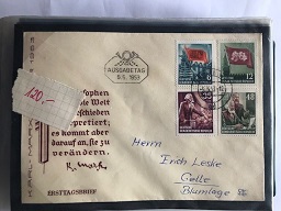FDC Album mit ca. 100 Belege DDR/Berlin etwas Saar fast vollständig bestücktes FDC Album mit knapp 100 Belege, viel FDC aus DDR 50er Jahre und Berlin, dabei auch etwas Schmuck-FDC, der Michel Katalogpreis liegt bei 600 €. Wer hat Lust diese schöne kleine Sammlung zu übernehmen?