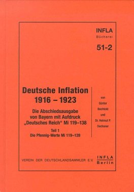 Mit dem Band 51-2 setzt Günter Bechtold zusammen mit Dr. Helmut P. Oechsner die Buchreihe fort, in der es um die umfassende Bearbeitung einzelner Inflationsmarkenausgaben geht. Der vorliegende Band beschäftigt sich dabei mit den Pfennig-Werten der Abschiedsausgabe von Bayern mit Aufdruck „Deutsches Reich„, wobei auch auf die bayerischen „Urmarken„ intensiv eingegangen wird. Auch dieses Buch lässt an Ausführlichkeit keine