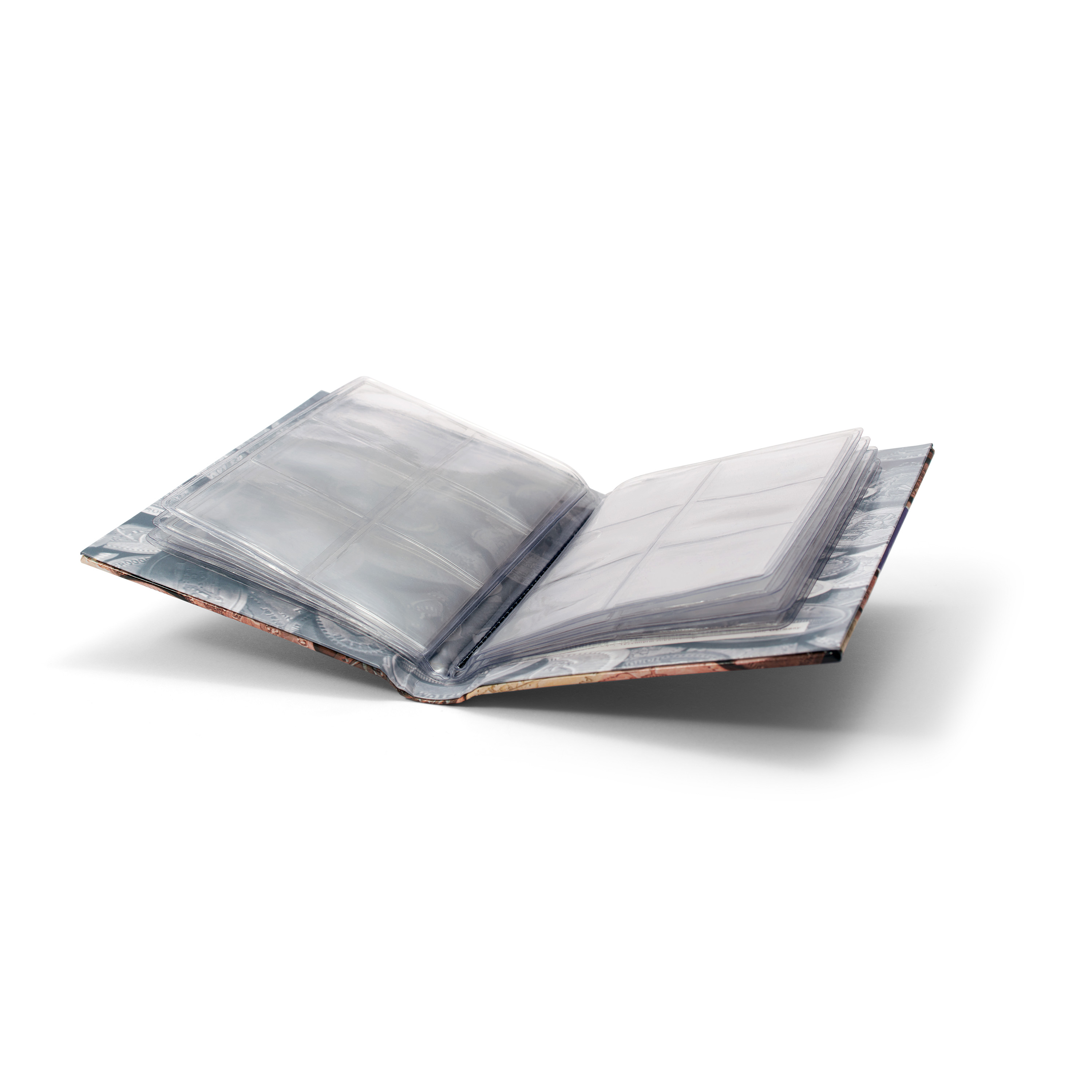 Album mit 8 festeingebundenen Münzhüllen mit weichmacherfreien Hart-PVC-Einschüben für jeweils 6 Münzen bis 33 mm Durchmesser.