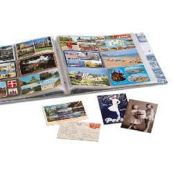 Album mit 50 eingebundenen Hüllen zur Unterbringung von bis zu 600 Postkarten (12 Postkarten pro Hülle bei beidseitiger Nutzung). Jede Hülle bietet sicheren Halt und Schutz vor Verunreinigungen. Hüllen aus klarsichtigem Kunststoff zur beidseitigen Betrachtung der Karten, wenn gewünscht. Praktisch und unempfindlich durch wischfesten Einband. Außenformat: 398 x 375 mm.