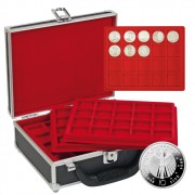 Abschließbarer Münzen-Sammelkoffer im edlen, schwarzen Aluminium-Design mit 4 roten Tableaus für 80St. 10 Euro-Münzen oder Münzen bis 36 mm Durchmesser. Die Tableaus sind äußerst stabil und rundum mit rotem Veloursflock überzogen. Dies gewährleistet eine angenehme Handhabung. Die acht Kunststofffüße garantieren einen sicheren Stand und schützen den Tisch, das Regal etc. vor Kratzern.