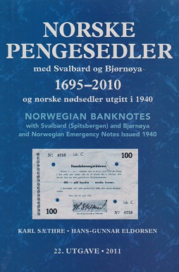 Saethre, Karl / Eldorsen Hans-Gunnar Norske Pengesedler med Svalbard og Bjørnøya 1695-2010 med Norske nødsedler udgivet i 1940 – 22. udgave – 2011