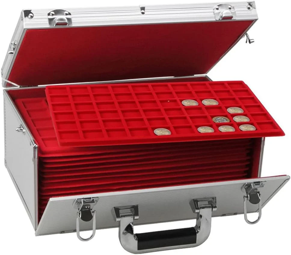 Mit 15 roten Einsätzen für verschiedene Münzendurchmesser. Koffer-Format ca. 350x245x165mm. Abschließbar, 2 Schlüssel.
