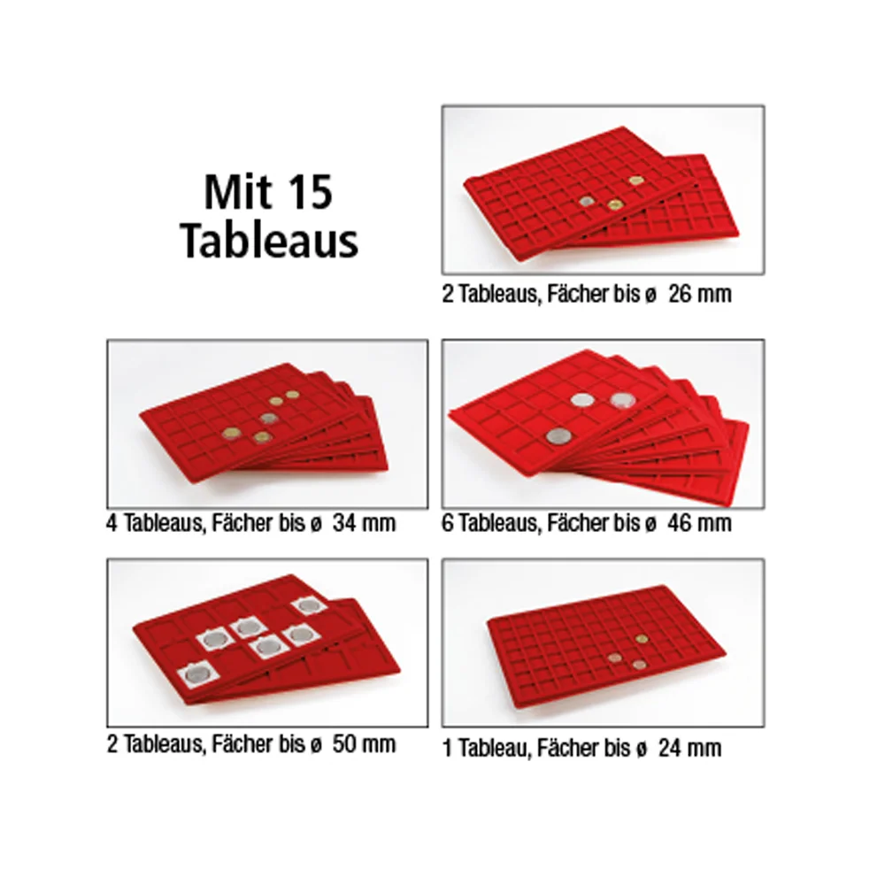 - Inkl. 15 roter Einsätze für Münzen verschiedener Durchmesser.