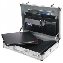 Hochwertiger Aluminium-Koffer, ideal für Laptops bis 18 Zoll und Aktenjeglicher Art. Anthrazit-graue Stoff-Innenaustattung mit einzelnen Fächern für Schreib- und Büro-Utensilien. Mit 2 Zahlenschlössern. Aussenmasse ca. 45 x 33 x 10 cm.
