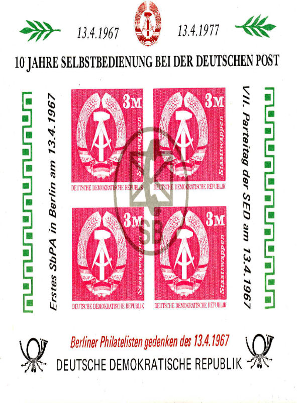 DDR Vignettenblock 10 Jahre Selbstbedienung bei der Deutschen Post. Erstes SbPA Berlin am 13.04.1967, VII. Parteitag der SED am 13.04.1967" (*)"