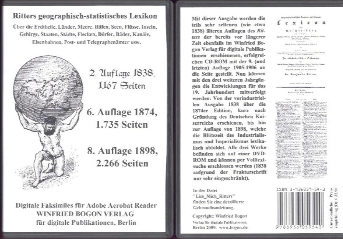 Ritter's geographisch-statistisches Lexikon über die Erdtheile, Länder, Meere, Buchten, Häfen, Seen, Flüsse, Inseln, Gebirge, Staaten, Städte, Flecken, Dörfer, Weiler, Bäder, Bergwerke, Kanäle, Eisenbahnen etc.; Leipzig, 2. Auflage 1838, 6. Auflage 1874, 8. Auflage 1898. Insgesamt 5.180 S. Digitale Nachdrucke für adobe acrobat reader auf DVD-ROM
