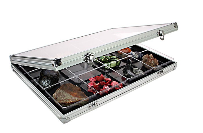 Sammelvitrine aus Aluminium mit transparentem Kunststoff-Einsatz mit 12 Fächern 87 x 90 mm.