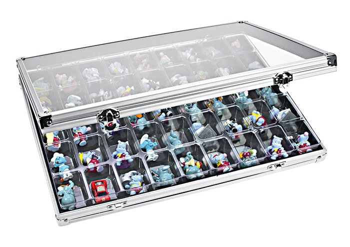 Sammelvitrine aus Aluminium mit transparentem Kunststoff-Einsatz mit 45 Fächern 36 x 49 mm.