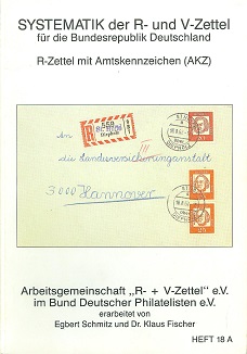 Schmitz, Egbert/Fischer, Klaus Systematik der R- und V-Zettel für die Bundesrepublik Deutschland R-Zettel mit Amtskennzeichen (AKZ) Auflage 1993, 2 Bände, zusammen 140 Seiten, Format DIN A5, broschiert. Systematik für Numerator und Text und Beispielsammlung.